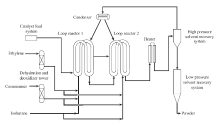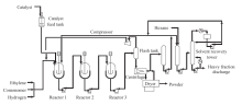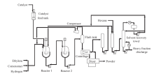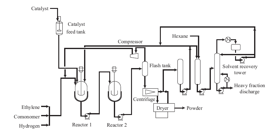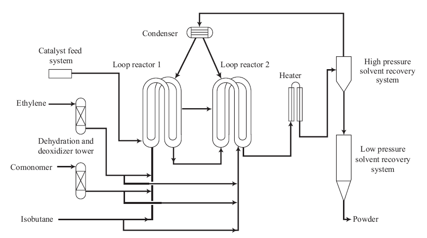 道达尔-雪弗龙淤浆双环管工艺可使用Ziegler-Natta、铬系和茂金属催化剂, 能够生产注塑料、管材料、中空料和膜料等产品。与其他淤浆双反应器不同, 道达尔-雪弗龙淤浆装置生产PE100管材料时, 第1反应器生产高分子量共聚物, 第二反应器生产低分子量均聚物, 且取消了中间处理单元。